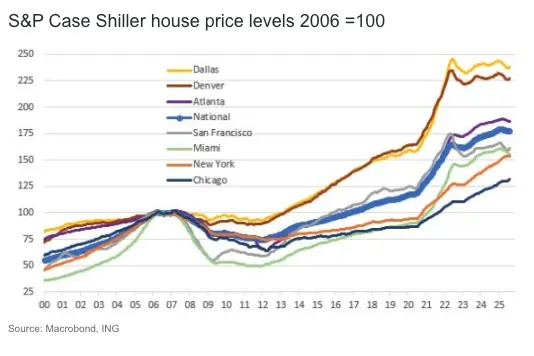 Phoenix, Miami and Las Vegas are the weakest, seeing prices fall 0.5-0.6% MoM, leaving the 3M annualised rates in a -8 to -10% range. The chart above is of house price levels rebased to 2006 = 100 to show how different markets have performed.