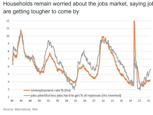 The "plentiful" vs "hard to get" jobs metric was little changed and continues to suggest upside risks for the unemployment rate. The premise being that workers see and feel changes in the jobs market before they show up in the official data – not that we are going to get another jobs report for a while, given the government shutdown. All in all, nothing here to argue against a 25bp Federal Reserve rate cut tomorrow.