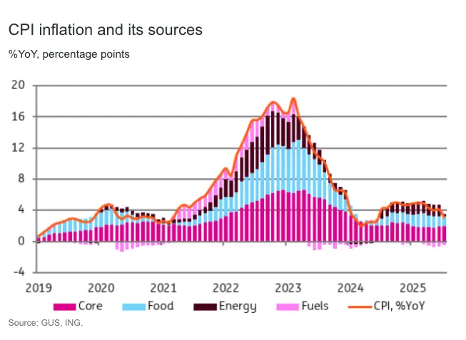 The decline in the annual inflation rate compared to June was mainly driven by a sharp slowdown in energy price inflation, which fell to 2.4% YoY from 12.8% YoY in June. This contributed to a reduction in annual inflation of approximately 1.2 percentage points from June. The drop was due to a base effect linked to the partial lifting of energy price freezes from July 2024. Fuel prices were working in the opposite direction; their decline eased in July to 6.8% YoY from 10.0% in June. We estimate that core inflation, excluding food and energy prices, remained at a similar level to June, when it stood at 3.4% YoY.