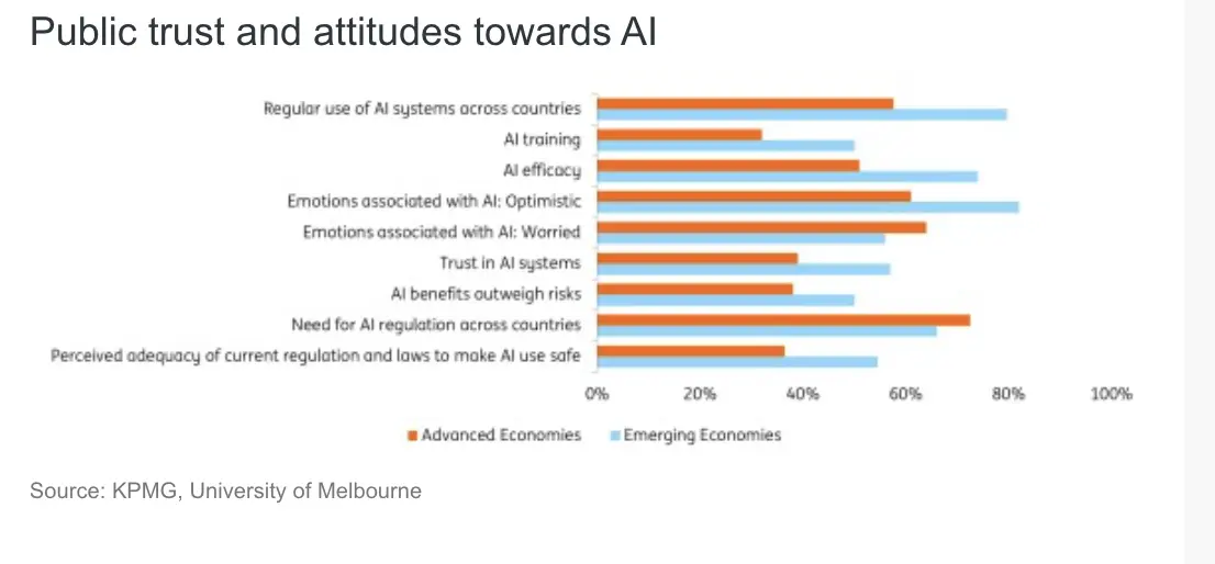 However, significant cross-country differences persist. On average, a larger proportion of respondents in emerging economies report using AI more, being better trained, and feeling more confident and optimistic about its usage than those in advanced economies. Conversely, respondents from advanced economies appear more worried and less trusting, with a smaller proportion believing that the benefits outweigh risks. Only a little over one-third of respondents in developed economies believe that current laws and regulations are sufficient for making the use of AI safe; more than half in emerging markets believe the same.