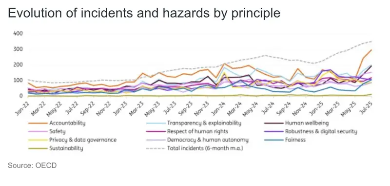 A McKinsey survey reports that organisations using AI surged from 50% in 2022 to 78% by July 2024 (around a 1.5-fold increase). While it is plausible that an increase in usage brings a parallel rise in AI-related incidents, the OECD’s AI Incidents and Hazards Monitor (AIM) reports incidents and hazards doubling over the same time period. A majority relate to the threat of accountability, transparency and human well-being. While the latter poses a direct risk to the UN’s Sustainable Development Goals, a lack of accountability and transparency of AI actors also risks erosion of trust in society and the ability to make informed decisions.