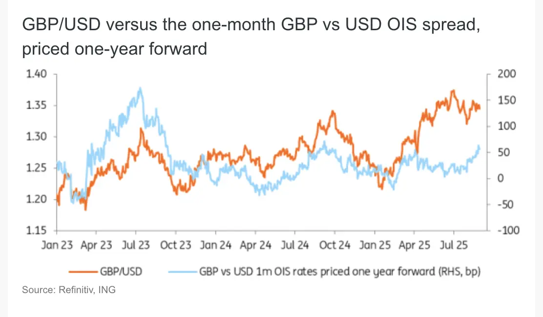 Following the hawkish BoE rate meeting, expectations for the terminal rate have climbed by around 20bp since early August, now approaching 3.60%. That stands in stark contrast to developments in the US, where the soft July jobs report and political pressure on the Fed have seen the terminal rate falling 35bp towards 3.00%. That’s managed to pull back GBP/USD from 1.32 to 1.35.