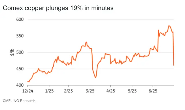 Until the announcement, copper prices in the US had been trading at a 28% premium over the LME prices, with the market front-running the expected tariff. We now expect the Comex-LME premium to collapse from the current levels.