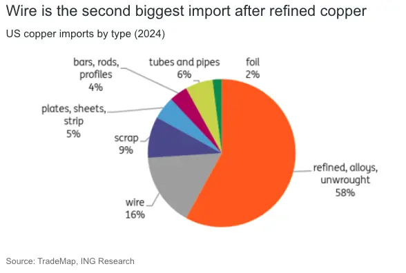 The 50% levies will apply to imports of semi-finished copper products, including copper pipes, wires, rods, sheets and tubes, and to copper-intensive goods like pipe fittings, cables, connectors and electrical components from 1 August, but not to imports of copper ore, concentrates, mattes, cathodes and anodes, according to the White House statement.