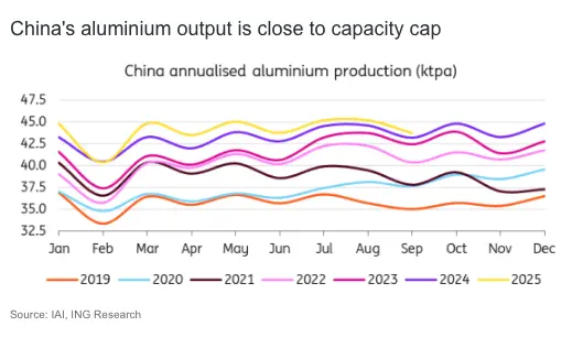 China’s aluminium output is close to its self-imposed 45 million tonne capacity cap. The global aluminium market looks largely balanced for next year, assuming the cap holds. This is also weighing on exports, keeping markets ex-China tight.