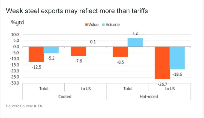 Steel exports have remained subdued in recent years, primarily due to a combination of weak global demand, China’s overcapacity, and diminished competitiveness of Korean products, rather than just tariffs. During the first half, the export value of coated and hot-rolled steel declined not only to the US, but also across other international markets. By product segment, it appears that coated steel had a lesser impact of the tariff than hot-rolled steel.