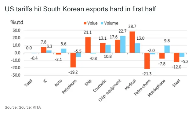 Semiconductors account for over 20% of Korea's total exports, making them the largest segment in the country's export portfolio. US tariffs have not directly impacted global chip exports so far, and global demand for AI technology remains steady. As a result, Korean chip exports increased by 7.8% in value and 3.3% in volume year-to-date in the first half of 2025, contributing significantly to overall export figures.