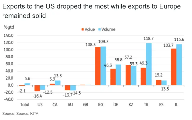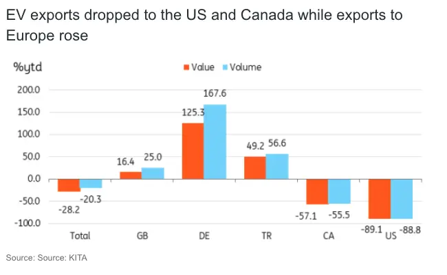 Narrowing the auto exports to electric vehicles, EV exports to the US dropped by 89.1% in value and 88.8% in volume, while Canada fell by 57.1% and 55.5%, respectively. US (-89.1% value, -88.8% volume) and Canada (-57.1% value, -55.5% volume) exports fell even more significantly. Tariffs are a major factor, but increased US production—such as Hyundai's new Georgia plant—and the end of EV tax incentives are also having an impact.