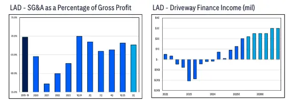 In our view, there were three positive read-throughs for LAD in 2Q: variable gross improved versus the three preceding periods, SG&A costs were down YOY and sequentially, despite expansion in UK, and Driveway Finance reported income of $20 million and is on track to contribute $80 million this year. In the near term, the trade agreements seem to be lifting the lid on potential M&A and a September cut in interest rates is positive for the total auto sector.