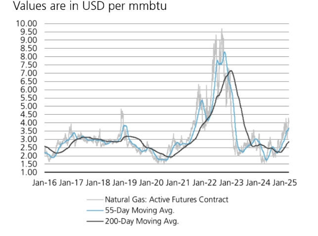 Natural gas inventories started the year at 385 billion cubic feet, or nearly 13% above the five-year average of 2019-23. Cold weather in the US dwindled the excess reserves, with inventories currently at 82 billion cubic feet, or about 4% above the 2019-23 average. Unsurprisingly, we saw prices fall from USD 4/mmbtu to USD 3/mmbtu in January on temporary milder temperatures, before moving up again to above USD 4/mmbtu amid a renewed cold snap.