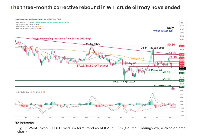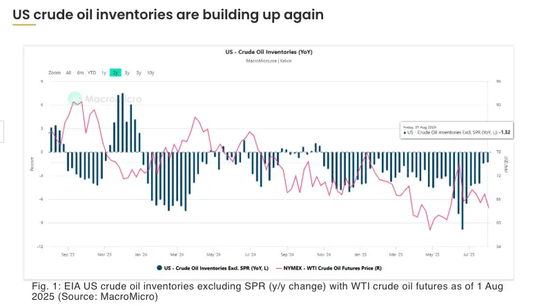 Since 20 June 2025, the drawn down of US crude oil inventories (excluding SPR) has slowed down from -9.9% y/y to -1.3% y/y as of 1 August 2025 based on data from the US Energy Information Administration (EIA) which suggests a potential build-up in oil inventories which is likely to put further downside pressure on the prices of WTI crude oil (see Fig. 1).