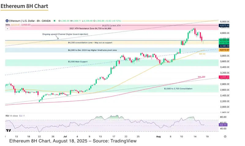 Ethereum's outlook doesn't look as bleak, with the ongoing retracement hanging around the $4,200 to $4,300 consolidation zone (yellow box).