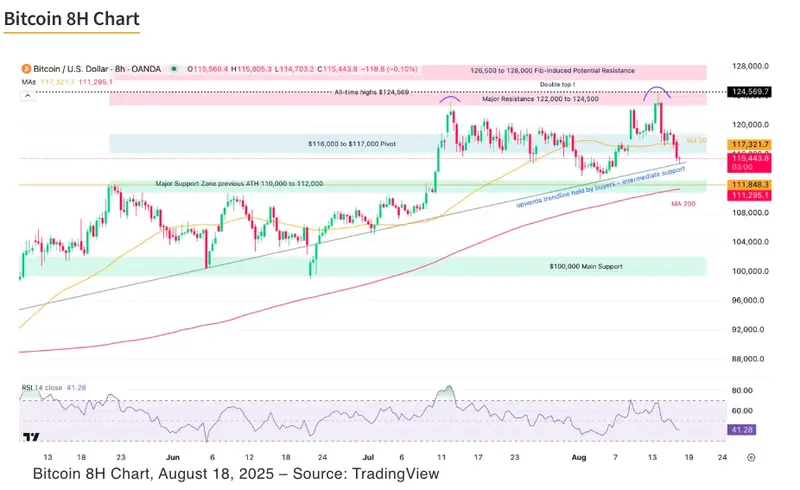 Bitcoin is $9,000 (7.20%) from its most recent ATH at $124,269, with the shape of the most recent highs appearing as a double top.