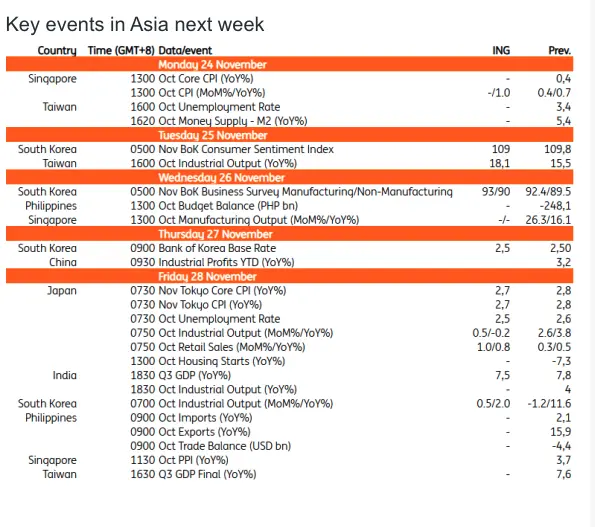 Tokyo’s consumer price index inflation is expected to rise 2.7% YoY in November, supported by solid wage gains. The weaker JPY probably added upward pressure. Industrial production will likely remain positive following Japan's trade agreement with the US. Despite a contraction in the third quarter, recent data suggest an economic recovery, supporting the Bank of Japan’s continued policy normalisation. Market expectations for a December rate hike have fallen sharply over the week. We believe that recent BoJ comments indicate at least three board members support a more hawkish stance. However, it remains unclear if others will agree. We continue to forecast a rate hike in December, though the likelihood of a delay to January is rising