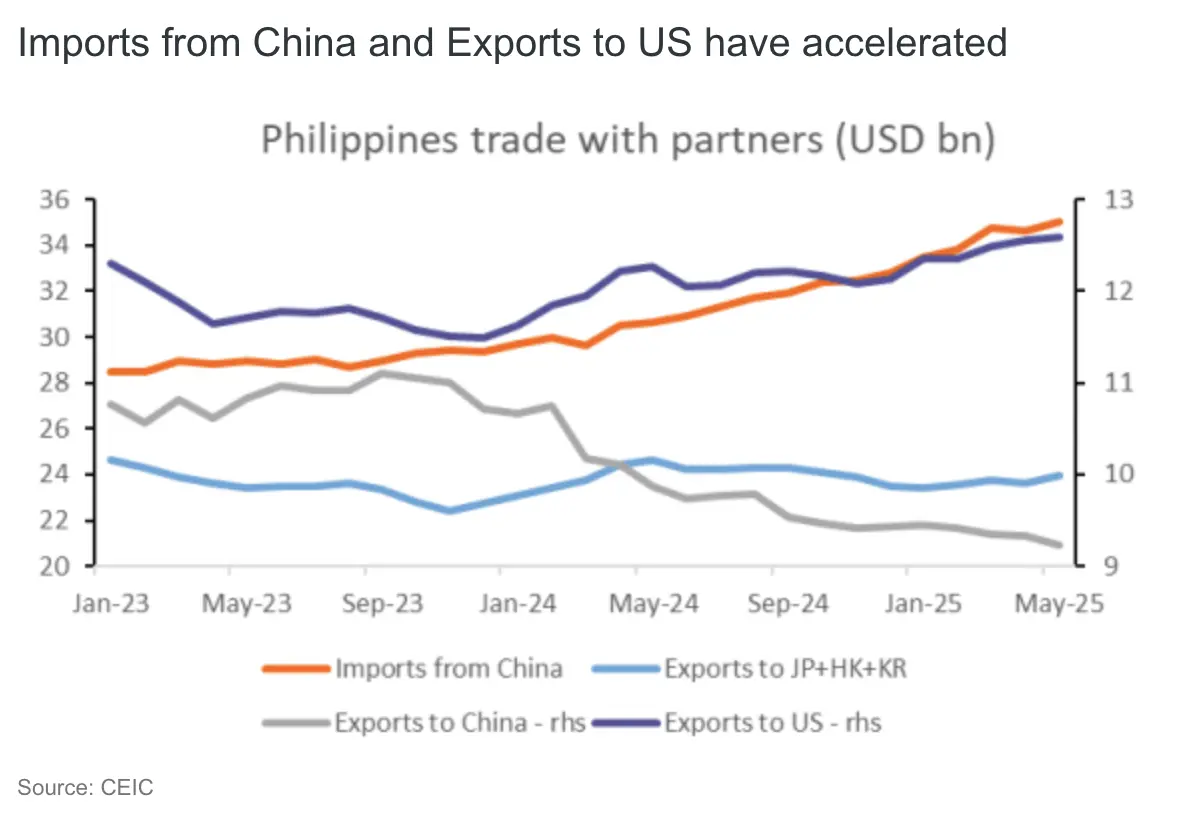 One of the factors behind the export surge (10% year-on-year in 2025) could be the re-routing effects -- a trend also observed in the trade data of other ASEAN economies. Recent trends indicate: (1) Exports to the US have clearly accelerated in 2025; (2) imports from China surged 14% year-to-date, with electronic products continuing to dominate among all commodity groups.