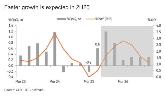 Meanwhile, the outlook for manufacturing and exports remains cloudy. Exports are likely to weaken in the second half due to tariffs and possibly lower US demand. Korea has yet to secure a deal with the US, and the US-Japan agreement creates challenges for Korean exporters. Given the high dependence on car and semiconductors exports, sector-specific tariff negotiations will be crucial. However, the bigger concern is declining global demand, particularly from the US. ING forecasts a sharp slowdown in US growth in 2H25, which could further weigh on Korean exports.