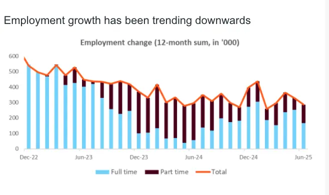 Labour market data also disappointed. Employment rose by just 2,000 in June, well below the consensus expectation of 20,000, while the unemployment rate edged up to 4.3% from 4.1% in May. Full-time employment contracted by 38,000, offset by a 40,000 increase in part-time jobs, which tend to be less stable and lower paying. Hours worked fell 0.9% month-on-month in June, also suggesting a weaker labour market.