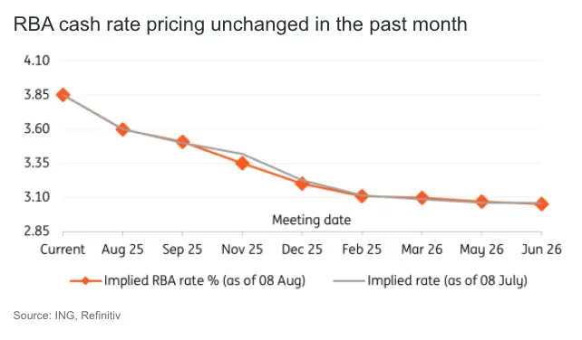 Markets were fully pricing in a rate cut at the August meeting within hours of July’s surprise hold. As discussed, recent data has largely validated short-term rate cut bets but has failed to shift expectations for future easing. The AUD OIS curve (chart below) remains largely unchanged since the day after the July meeting, with approximately 62 basis points priced in for year-end and a terminal rate around 3.00–3.10%.