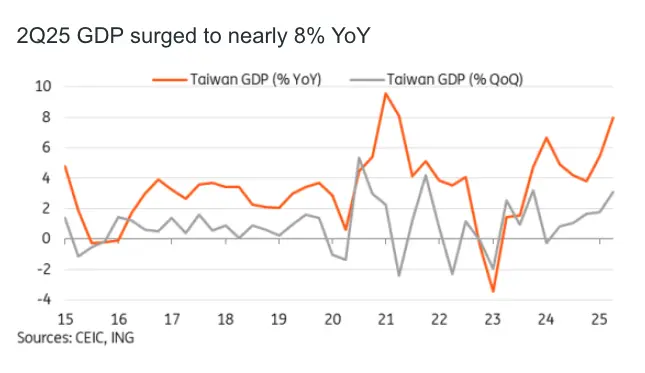 Overall, Taiwan's economy has fared far better than many market participants had expected at the start of the year. The heavy demand driven by the AI boom, combined with the fear of incoming tariffs, led to blistering export growth year to date.