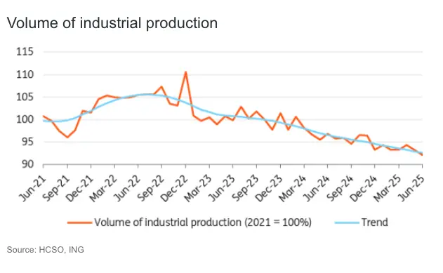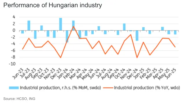 In terms of GDP growth, the industrial decline in June is definitely an unfavourable turn of events, as it means that the outlook for the sector for the whole year is now more negative, and it is now foreseeable that the sector could significantly drag down the performance of the Hungarian economy in 2025 as a whole. We continue to expect an average annual contraction of around 4.0-5.0% in industry this year.