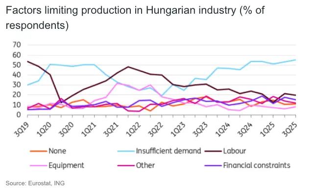 Various confidence indices have shown a further deterioration in the outlook in recent months. This means there are no signs of a clear turnaround in industrial prospects. This grim outlook is reinforced by domestic companies' assessment of industrial capacity utilisation in the third quarter, which has also worsened (from 76.7% in 2Q to 73.6% in 3Q). Based on this, we can’t necessarily expect a significant turnaround. Furthermore, the series of negative signs continues. More than half of the surveyed companies say they cannot produce optimal quantities due to low demand. A similar ratio of responses was last recorded in 2010, following the global financial crisis.