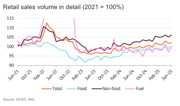 Unfortunately, the retail sector was unable to provide any positive surprises. In June 2025, the volume of Hungarian retail sales fell short of market consensus. The good news is that, in this case, it does not indicate an outright decline, only slower growth. On a monthly basis, the sector grew by 0.5%, translating to a 3.0% year-on-year increase. Due to last year's low base, the overall picture based on the annual index has improved slightly compared to May.