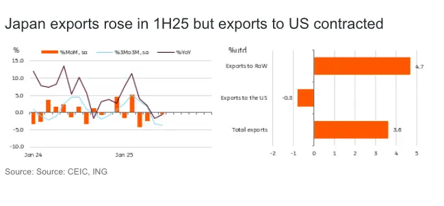 Japan's primary export is transportation equipment, mainly cars. In 1H25, car exports increased by 0.6% in value and 1.5% in volume. In the US, volumes rose 5.1%, outpacing the rest of the world (0.3%). But values dropped 3.4% compared to a 3.0% rise elsewhere. This suggests that automakers frontloaded their products and lowered prices to offset tariffs.