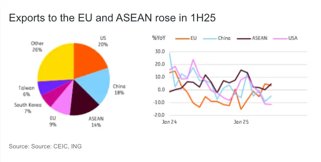 Exports increased by 3.6% year-to-date in the first half of the year, even as growth rates turned negative towards mid-year. We observe that US tariff-related noise created monthly volatility during the first half. This was somewhat expected, as front-loading boosted first-quarter exports but pulled forward demand that might've shown up in the second quarter. Also, we see clear weakness for exports to the US, which dropped -0.8%.
