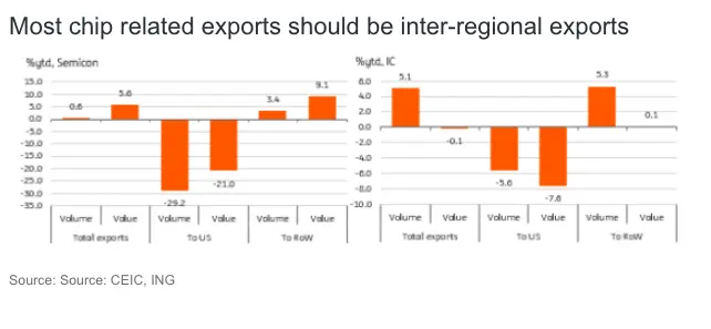 Chip-making equipment and semiconductors rose 4.3% and 5.5%, respectively. These two account for about 10% of total exports. This growth is likely due to tariff exemptions and substantial AI investments. Similar trends are seen in Taiwan, South Korea, and Malaysia.