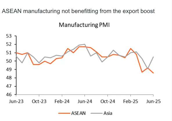 Looking ahead to the third quarter, we expect Asia export growth to slow down. The recent surge in shipments - driven by businesses rushing orders ahead of tariff deadlines - is likely to reverse. On top of that, global demand is showing signs of fatigue, and persistent uncertainty in the business environment is expected to further dampen trade flows in the months ahead.