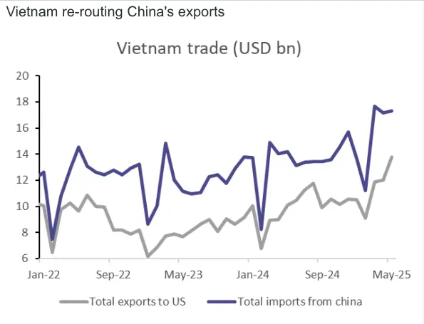 Adding to the complexity, none of the ASEAN economies is currently close to securing a trade deal with the US. If the universal 10% tariffs remain in place beyond 9 July, we may see another uptick in re-exporting through ASEAN, as the tariff gap between China and ASEAN stays wide. However, this would offer limited support to local growth and could eventually trigger a tougher response from the US, possibly in the form of higher tariffs on countries seen as re-routing Chinese goods.