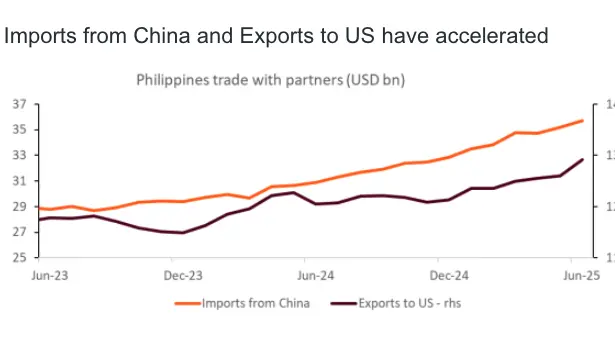 The upside surprise was driven entirely by strong export performance. Net exports contributed positively to GDP growth (+0.1% YoY), reversing a sharp drag in the first quarter (-2% YoY). Goods exports surged by 14% YoY, while import growth slowed to 2.7%, suggesting a significant front-loading of exports – particularly in electronics, manufactured goods, and gold.