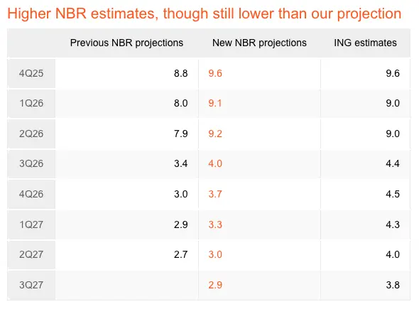 The NBR now sees inflation at 9.6% by the end of 2025 (up from 8.8%) and 3.7% by the end of 2026 (previously 3.0%). These adjustments were largely anticipated by markets after the August print of 9.8%, which captured the impact of higher VAT and excise duties. According to the report, electricity prices, tax hikes, and inflation expectations are key drivers, with the combined effect of VAT increases, excise duties, and electricity accounting for nearly half (4.7 percentage points) of the December 2025 projection. Once these factors drop out of the statistical base in mid-2026, inflation is expected to glide toward 3.0% by year-end.