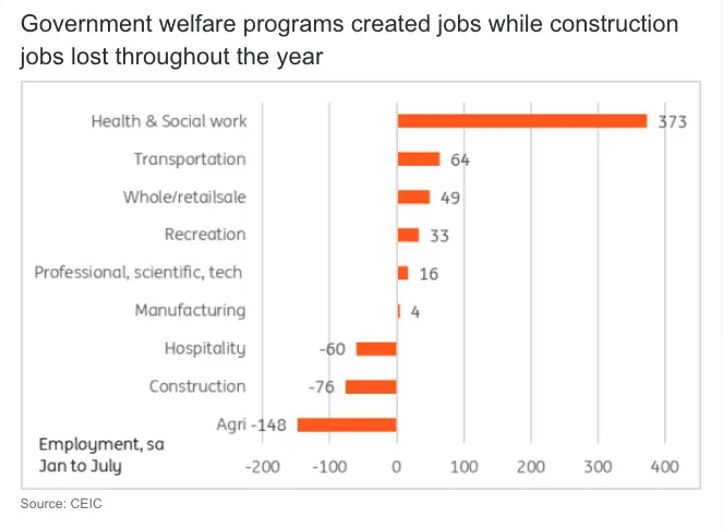 South Korea’s unemployment rate edged down to 2.5% in July, compared to 2.6% in June and market expectations. However, underlying indicators were less positive than the headline figure implies. The labour participation rate fell to 64.4%, marking its third consecutive monthly decline. Private sector hiring remained subdued. Manufacturing employment, meanwhile, decreased for the second month in a row. Construction has shed jobs in six of the past seven months in 2025. The sector is expected to be a significant drag on overall growth, with conditions potentially more challenging than we had previously thought.