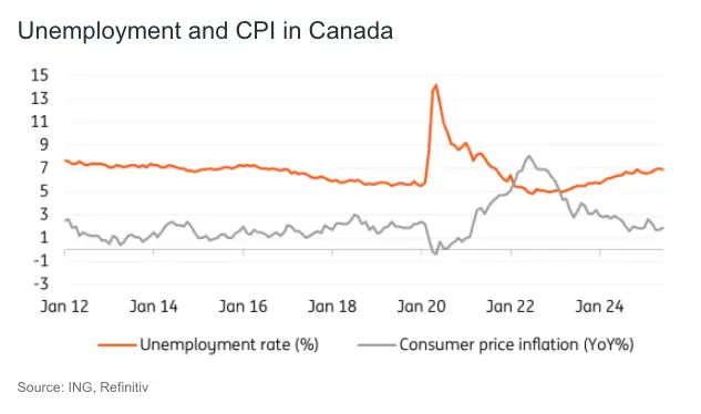 In response to unexpectedly positive data and renewed trade tensions, the Bank of Canada is likely to hold interest rates at 2.75% at its 30 July meeting. In June, unemployment fell to 6.9%, with total employment rising by 83.1k. Even though headline CPI has increased to 1.9%, the month-on-month rate is benign at 0.1%, with the Bank of Canada’s consumer and business surveys also improving. Compared to the first quarter, consumer job loss fears and inflation expectations have decreased, with fewer firms reporting direct impacts from tariffs.