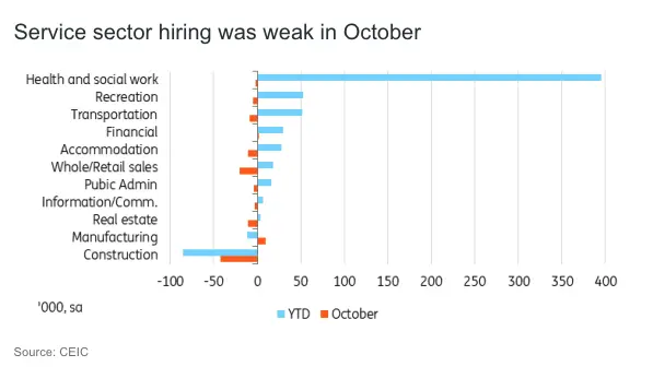 By industry, manufacturing hiring increased 10k for the first time in five months, and business sentiment recently improved slightly. This offers hope for a continued recovery. However, construction and service hirings were quite weak. Construction shed jobs 42k, not fully reversing the previous month’s 51k gain. We expect construction to bottom out in the fourth quarter. However, today’s data was somewhat discouraging compared to our view. Hirings remained subdued throughout key service sectors, including wholesale and retail trade (-20k), transportation (-9k), hospitality (-11k), and real estate (-11k).