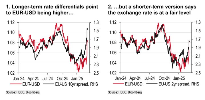 We cannot ignore when the facts change, especially when they relate to politics. Some of the biggest impacts on major exchange rates have come through this channel (eg, Trump, Brexit, Japan Abe’s Three Arrows, Eurozone sovereign crisis). Having had a pessimistic view on EUR-USD since September 2023, we need to recalibrate in response to the German election result and fiscal change. At this stage, it is not straightforward to decipher how much of the German political change is in the EUR’s price. Longer-term interest rate differentials suggest there is room for EUR- USD to rise further towards 1.11 (Chart 1).