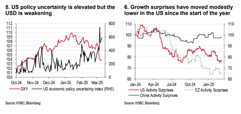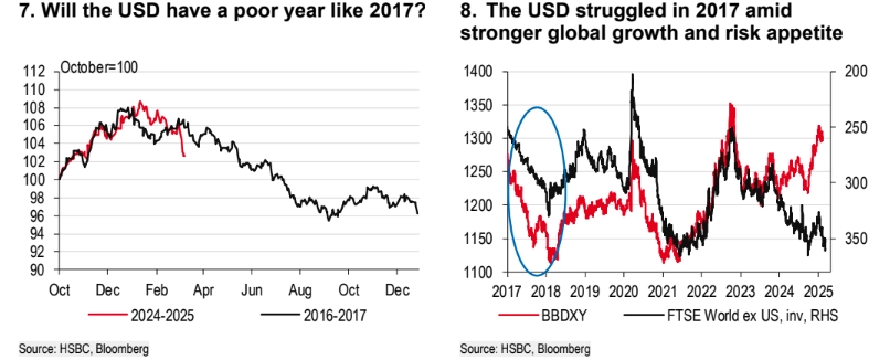 The idea of the US economy losing momentum has some validity, but it needs to be put into perspective. Some survey and hard data have shown weakness, but other indicators do not. US growth surprises are also not deteriorating as in mid-2024 (the last period of growth worries), while the other large economies like China and the Eurozone are not giving a much better impression (Chart 6). Nonetheless, we still come across the line of thinking of what might cause the USD to repeat its dismal performance in 2017, the first year of Trump’s prior administration.