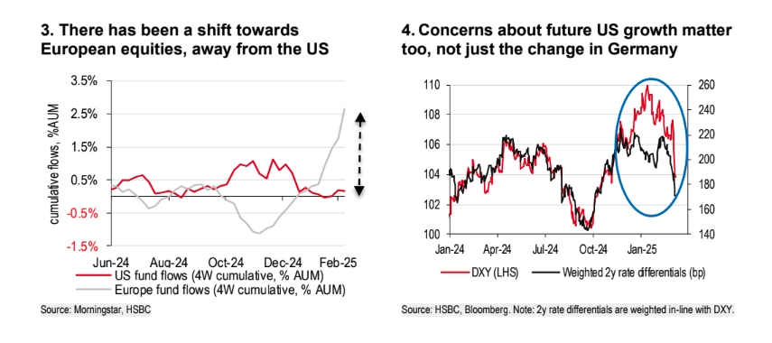 In the coming weeks, there will be an ongoing assessment on how Germany’s coalition government implements its new fiscal plan and whether the real economy could benefit. We also expect heightened sensitivity to the German survey data to understand how business confidence readings versus market expectations evolve and if the greater foreign demand for European equities – in contrast to the US – continues (Chart 3).
