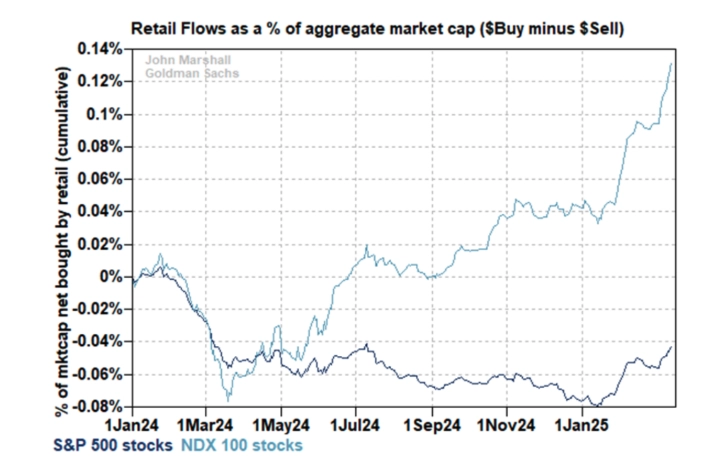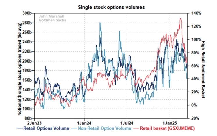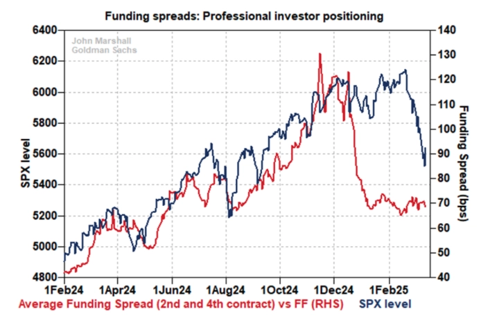 This was the key metric that warned us that asset managers were selling late last year and helped us become more cautious ahead of the drawdown. Demand for length in the futures/swaps/options markets continues to be much weaker YTD than in 4Q24. We still view this chart as a negative signal, but given the gap has closed more than halfway between the market and this measure, this signal only suggests being half as bearish. Given the lack of movement of funding spreads we have shifted our focus to other positioning measures that tell us about retail investor and hedge fund positioning.