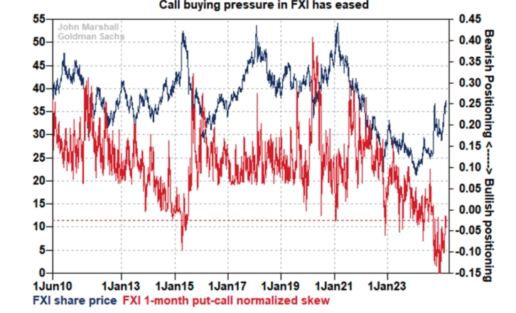 Following the recent rally in FXI, investors are less excited about buying calls for further upside asymmetry.