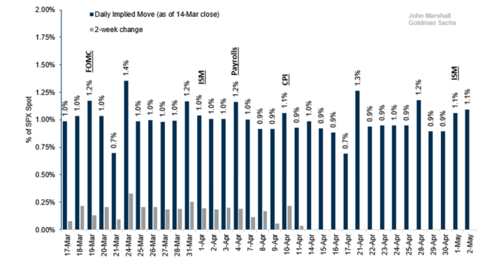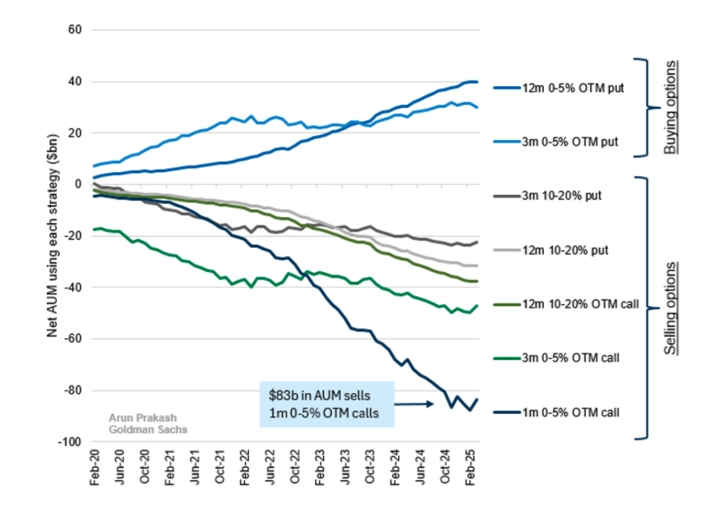 These strategies represent nearly $200b in AUM (up from $150b last year) and systematically hold positions on $310b notional in options (some hold multiple positions). Biggest selling pressure: Net call selling across 1m, 3m and 12m options is most notable at a combined $168b of AUM. Biggest buying Pressure: Net put buying across 3m and 12m options is next most notable at a combined $70b of AUM.