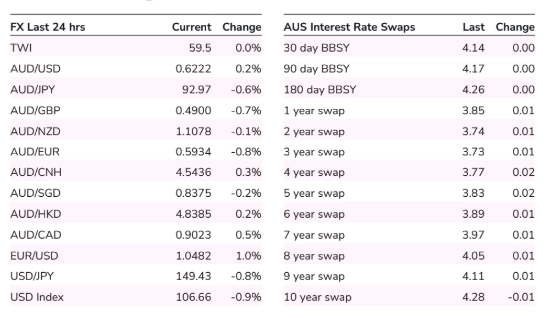 • A rally in the bond markets continued, with the 10Y US Treasury losing another 5bp to 4.16%, down 40bp in around two weeks. Other key tenors across the Treasury curve showed similar changes. Despite lower euro area inflation, German Bunds and other European government bonds bucked that trend and sold off, sending the 10Y Bund yield 9bp higher to 2.49%. Yesterday Australian government bond yields headed higher too. The 10Y was up 3bp to 4.33%, opening up the highest spread to an equivalent US Treasury yield since last November.