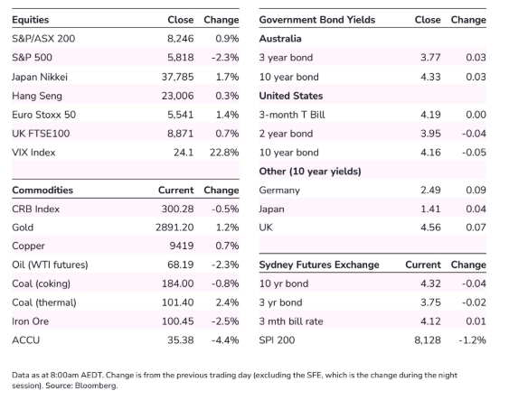 • The US equity market sold off, with the S&P 500 index falling 2.3%, the worst daily result since around mid- December. NVIDIA’s share price was down almost 9% on the day. Trading before the latest Trump comments on tariffs, European stocks were on much firmer footing, with Euro Stoxx 50 gaining 1.4%, as the industrial sector, and defence stocks in particular, rallied on the prospects of higher military spending. Domestic and Asian equity price indices headed higher yesterday following gains in the US market on Friday.
