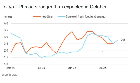 Tokyo CPI inflation increased 2.8% year-on-year in October (vs 2.5% in September, 2.4% market consensus). October is typically the month when companies adjust prices. A 0.6% month-on-month, seasonally adjusted, increase suggests businesses are raising final prices in response to input price hikes. Prices increased for both goods (0.9%) and services (0.4%), with notable gains in labour-intensive sectors like transport, communication, and entertainment.