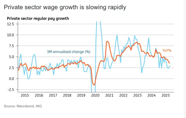 Having started the year close to 6%, private sector pay is now rising by 3.9% in annual terms. In fact, wages are rising by just 3% in three-month annualised growth terms, which gives a clear sense of just how much momentum has slowed through the summer. Those annual growth rates should steadily move lower over the coming months.