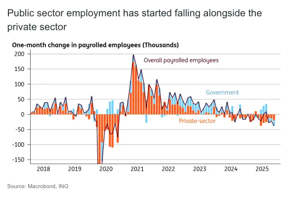 Until recently, that was helpfully offset by resilience in government hiring, but that appears to be changing. Public sector employment has also now fallen for three consecutive months, judging by those payroll numbers