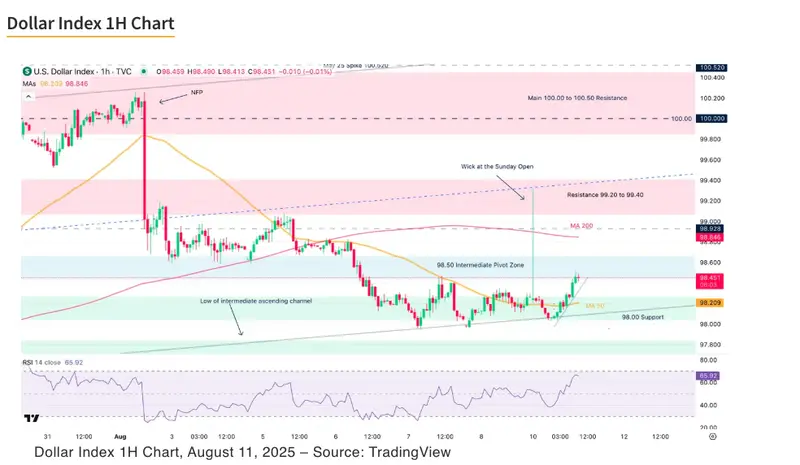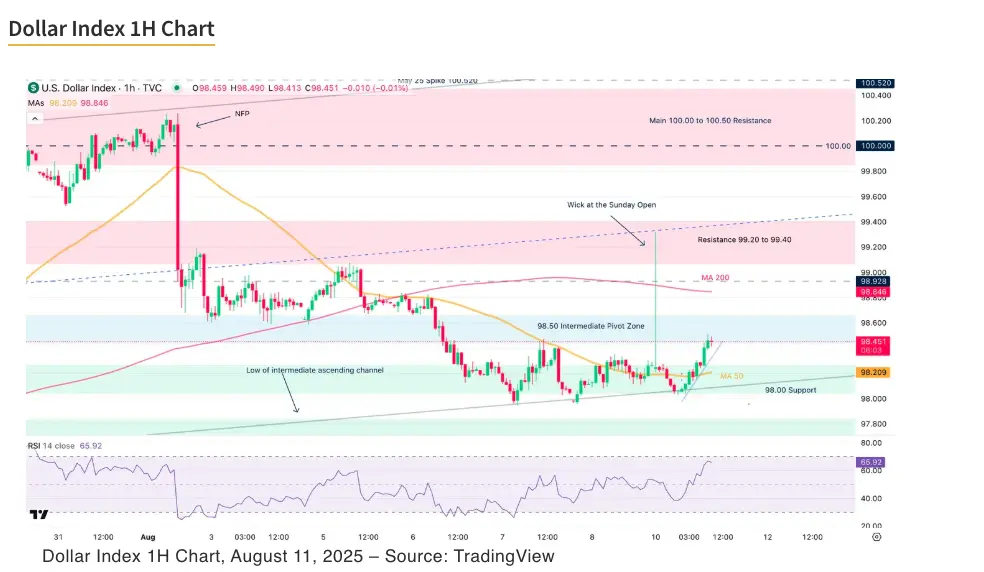 After a bullish NA weekly open for the USD, buyers are facing the 98.50 Pivot Zone leading to some ongoing consolidation.