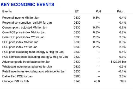 Barring volatile food and energy components, the so-called core PCE price index is projected to have risen 0.3% in January and 2.6% on an annualized basis. Moreover, data gauging consumer spending for January will be released. The consumer spending data is expected to show a 0.1% rise after seeing a jump of 0.7% in the month prior. Meanwhile, personal income likely rose 0.3% in the previous month.