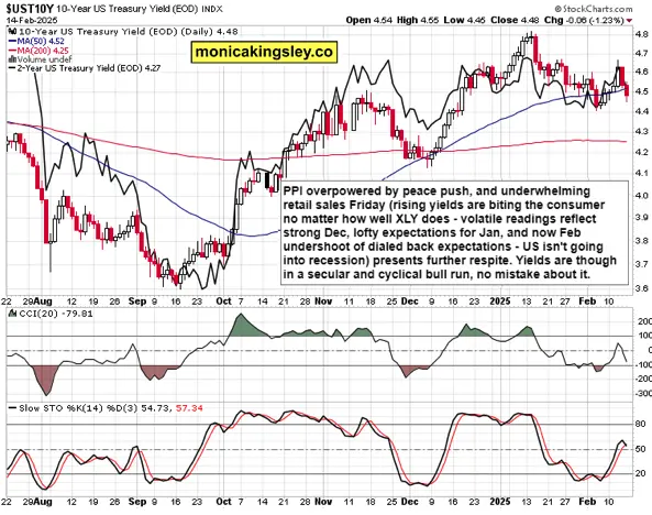 S&P 500 didn‘t slide on poor retail sales, and why should it? Yields have retreated, and another day of decent rotations (tech and financials pulling higher) has kept the index little changed, while Nasdaq goes on outperforming, and that‘s a good sign speaking in general.